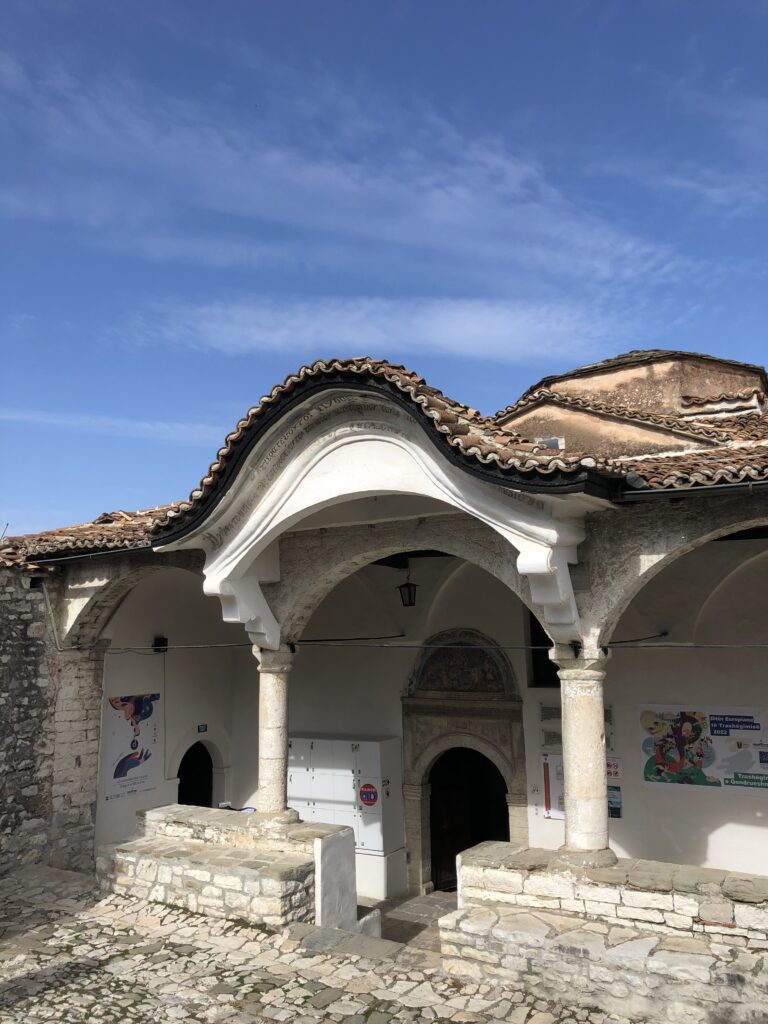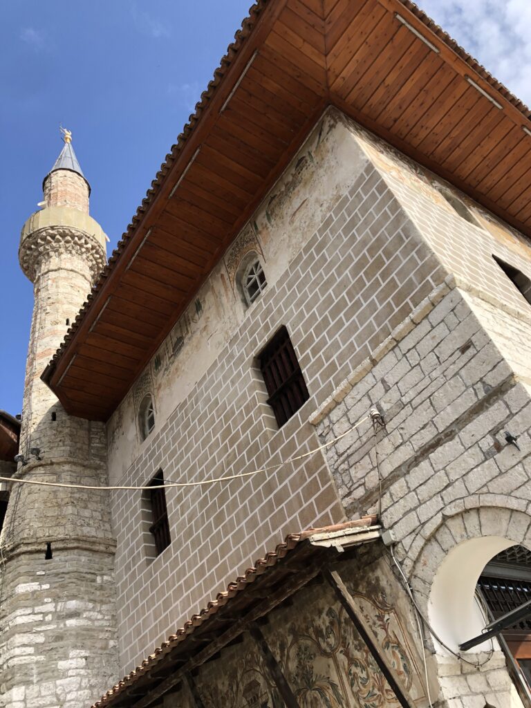 La storia della città è antichissima, e nasce dalla presenza di una fortezza illirico-macedone chiamata Antipatrea, nel III secolo avanti Cristo. I secoli successivi vedranno avvicendarsi la presenza di tantissimi popoli, dai macedoni ai romani, dai bizantini ai bulgari, dai serbi agli epiroti, dai veneziani ai turchi. Proprio alla presenza di questi ultimi si deve la componente islamica che in questa città si concentra soprattutto nel quartiere di Mangalem. Qui si trovano tre grandi moschee, quella del Sultano, quella del Piombo, per via del materiale della cupola, e quella degli Scapoli. Quella più vicina al fiume è proprio quest’ultima, caratterizzata da interessanti affreschi sulle pareti esterne. Si chiamava così, perchè era stata costruita per i garzoni e gli artigiani ancora senza moglie.