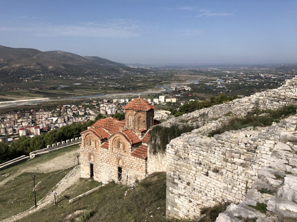 Salendo nella parte alta della città, si fa ingresso nel terzo quartiere, quello del castello. Le mura, pressoché intatte, risalgono al despota d’Epiro, Michele Angelo Comneno, che le costruì nel XIII secolo. Nel Quattrocento vennero ulteriormente fortificate dai veneziani. In questa parte della città, tradizionalmente cristiana, rimangono alcune chiese, fra cui quella dedicata alla Dormizione di Maria. Al suo interno è stato allestito il museo Onufri, dedicato al più importante pittore albanese di icone che lavorò con grande successo nel XVI secolo.