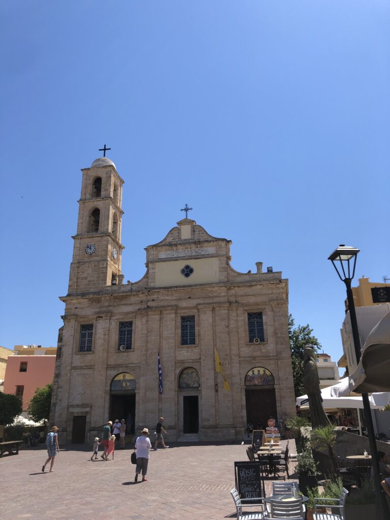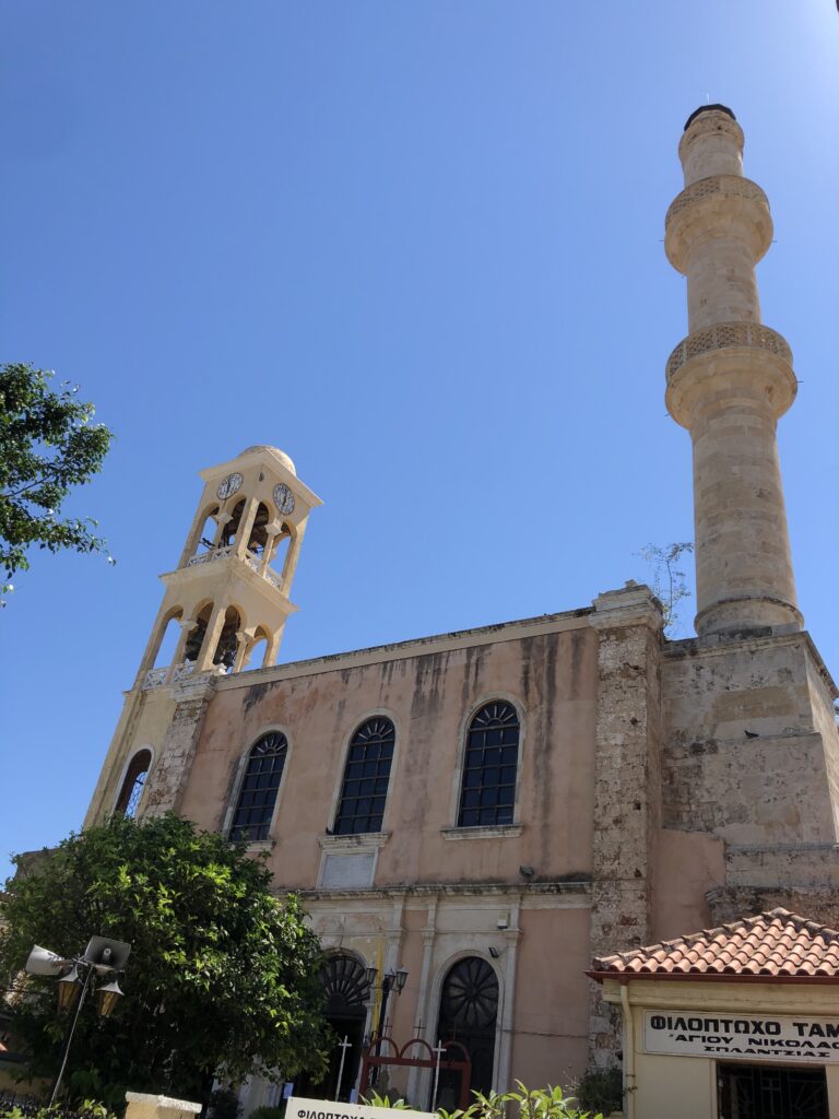 Le tracce che lasciarono i turchi non si limitarono solo all’architettura civile, ma anche a quella religiosa. Vediamo per esempio, come di fianco alla facciata della chiesa ortodossa di Agios Nikólaos rimanga un minareto. La chiesa, fondata dai Domenicani in epoca veneziana, fu in seguito trasformata in moschea, e solo nel 1918 riportata al culto cristiano.