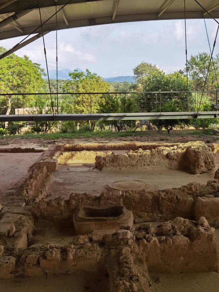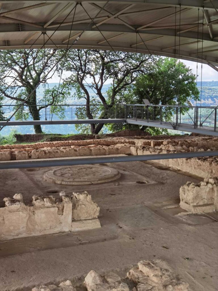 Poco più a nord si trovano invece i resti di un antichissimo palazzo di epoca micenea. Ai ritrovamenti, fatti a inizio Novecento, seguirono gli scavi degli anni Cinquanta, che portarono alla luce molti reperti importanti, fra cui delle tavolette con iscrizioni in lineare B, la lingua usata dai micenei più di tremila anni fa.