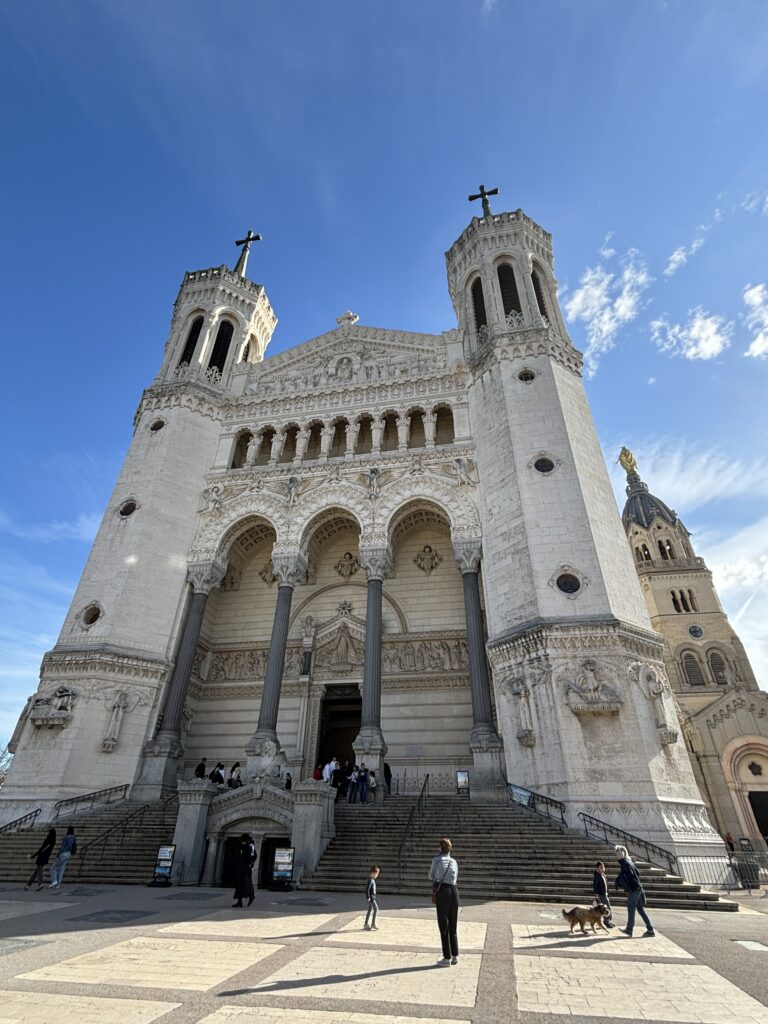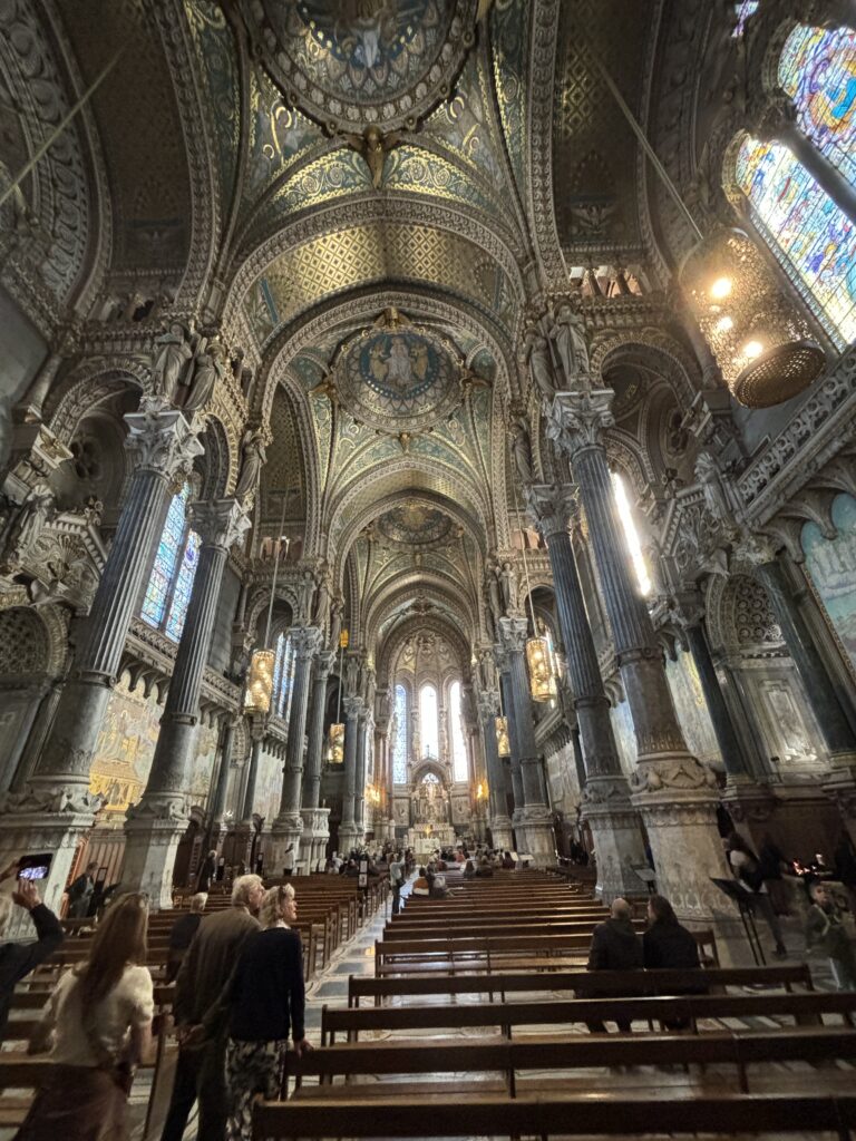 Sull’altura si trova anche una delle chiese più iconiche e suggestive di Lione, Notre-Dame-de-Fourvière, basilica costruita a fine ottocento, con una struttura bizzarra che la fa assomigliare a un elefante rovesciato, ma con un interno ricchissimo, di gusto spiccatamente neobizantino.
