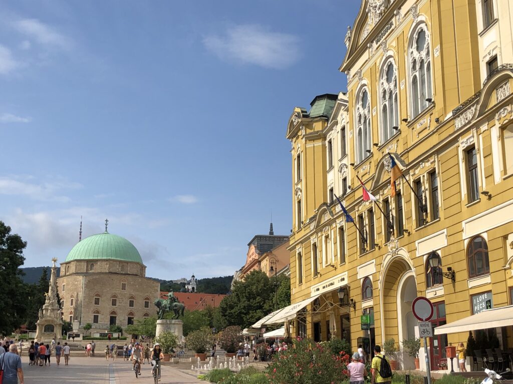 La sua bellissima posizione, difesa dai venti del nord da un massiccio boscoso, la rende ancor oggi una delle città più gradevoli dell’intera Ungheria. Dopo essere stata fondata dai romani, Adriano la elesse a capitale della Pannonia meridionale. Durante il medioevo, periodo in cui entrò anche nell’orbita del mondo germanico, divenne nota col pittoresco nome di Fünfkirchen, ovvero Cinquechiese, ed assistette alla costruzione della prima Cattedrale d’Ungheria e alla prima Università del paese, nel 1367. Fra il Cinquecento e il Seicento fu occupata dai turchi, ma una volta liberatasi, nel 1686, la sua vita rifiorì e diventò un centro famoso per la produzione di guanti e porcellane (con il famoso marchio Zsolnay). Oggi è una città vivace di quasi 200.000 abitanti, con i limiti di una terra in cui tranne Budapest, tutte le altre città assumono un’aria tranquilla e di provincia.