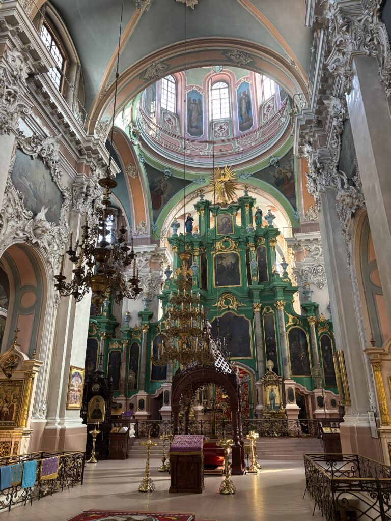 Quasi alla fine del corso centrale, entrando in un cortile alberato si raggiunge la Chiesa dello Spirito Santo, il maggiore luogo di culto ortodosso della città. Bellissimo il suo interno rococò e l’iconostatsi caratterizzata da un colore verde tipico dell’ortodossia russa.