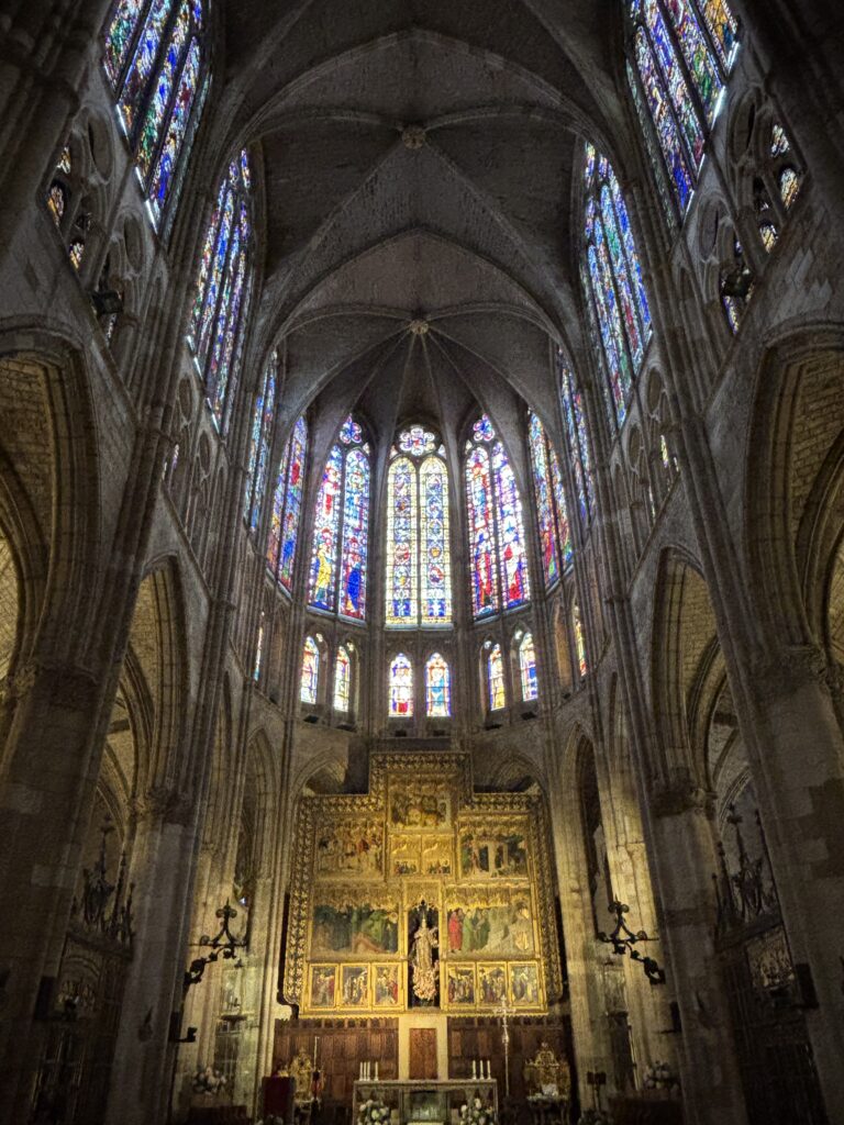 Altrettanto magnificente è l’interno, illuminato da numerosissime vetrate decorate, di grande pregio ed alcune risalenti addirittura al Duecento. La struttura gotica della chiesa viene sottolineata ancora di più dall’effetto di leggerezza che le vetrate conferiscono alla Cattedrale.