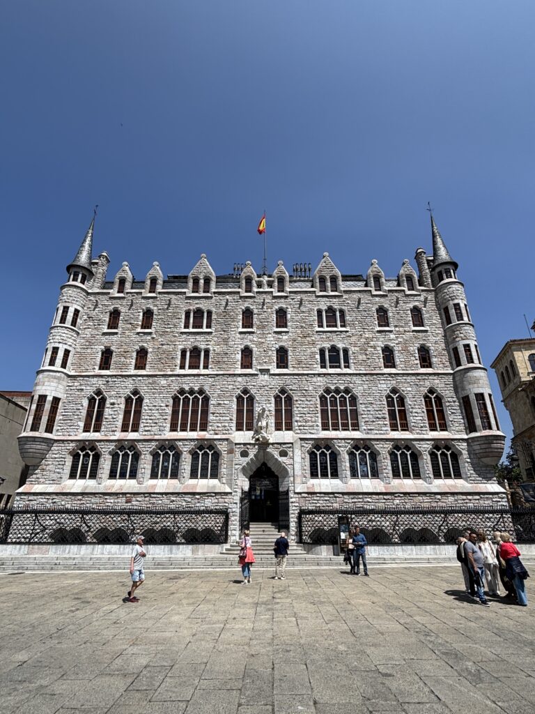 Il palazzo che oltre la Cattedrale richiama più turisti e visitatori a León è questo particolare castello fiabesco che si deve alla fantasia di uno dei più illustri architetti d’Europa. Si tratta di Casa Botines concepita dal geniale Antoni Gaudí. Questo progetto di fine Ottocento fonde le nuove concezioni architettoniche dell’epoca, con uno stile che voleva richiamare il rigore magico degli antichi castelli, nelle forme e nelle simbologie. Vediamo le torri a punta che caratterizzano gli angoli dell’edificio, le particolari finestre, il portone rastremato e la statua di San Giorgio e il Drago che indica già la conversione religiosa che sarà la cifra della vita dell’architetto. Molto interessante anche l’uso del ferro nelle cancellate che corrono attorno al palazzo.